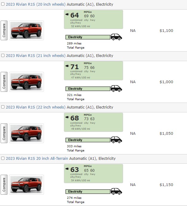 2023 Rivian R1S and R1T Dual-Motor EPA range